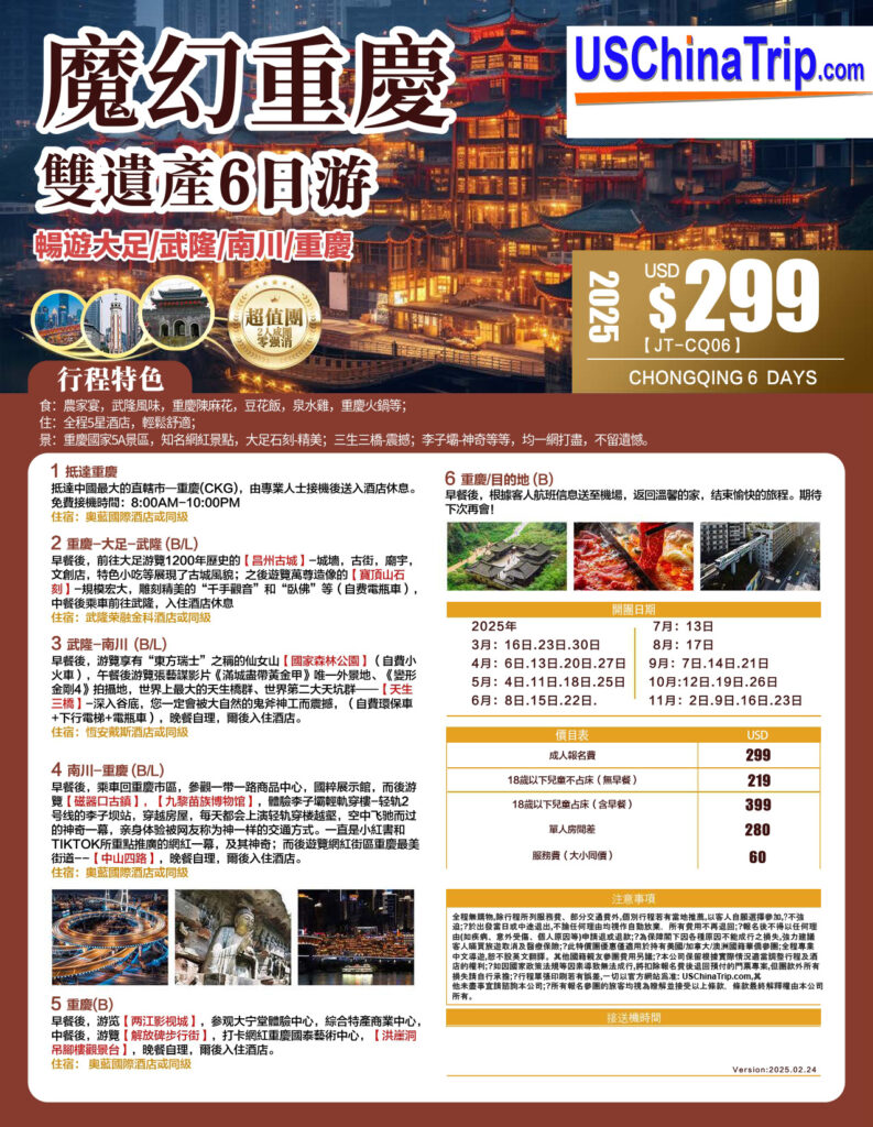山城重慶夢幻 6 天遊 (2025) – $299 行程特色:食:農家宴,武隆風味,重慶陳麻花,豆花飯,泉水雞,重慶火鍋等; 住:全程5星酒店,輕鬆舒適; 景:重慶國家5A景區,知名網紅景點,大足石刻 – 精美;天生三橋 – 震撼;李子壩 – 神奇等等,均一網打盡,不留遺憾。>>Detail Previous Next LEAVE COMMENT Cancel reply Save my name, email, and website in this browser for the next time I comment.