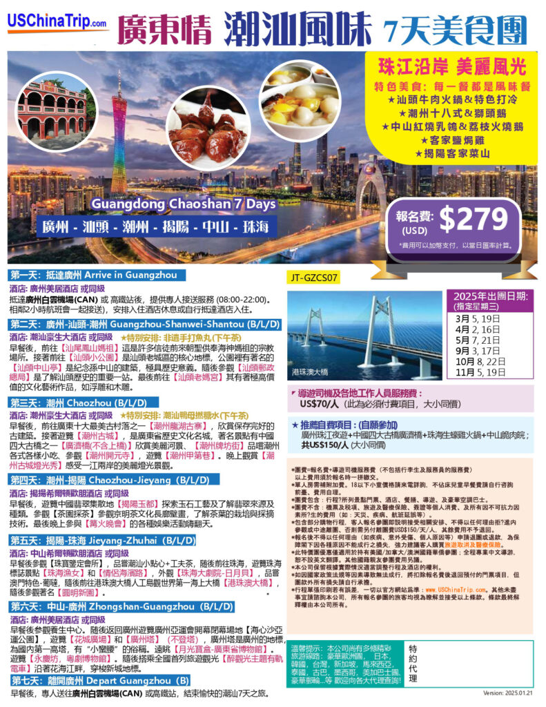 廣東情潮汕風味 7 天美食團(2025) – $279 特色美食: 每一餐都是風味餐汕頭牛肉火鍋 & 特色打冷 潮州十八式 & 獅頭鵝 中山紅燒乳鴒 & 荔枝火燒鵝 客家鹽焗雞 揭陽客家菜山>>Detail Previous Next LEAVE COMMENT Cancel reply Save my name, email, and website in this browser for the next time I comment.