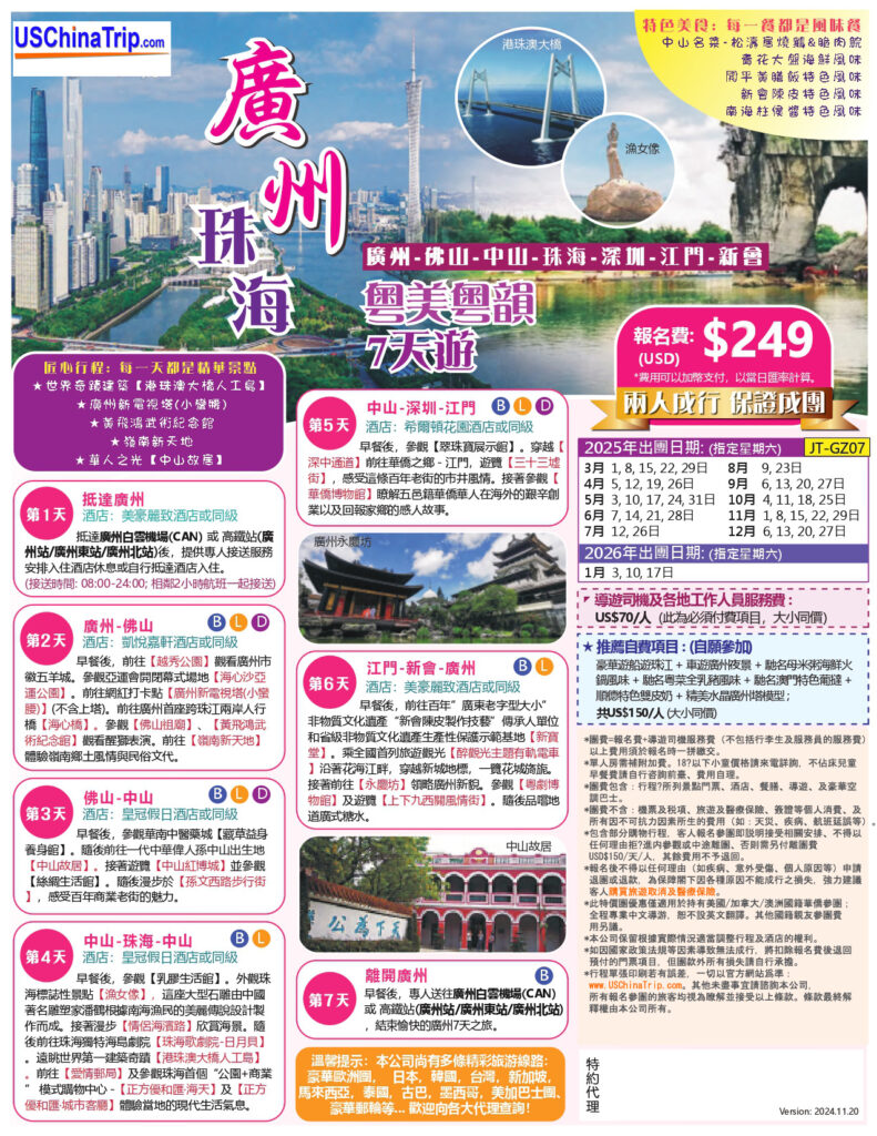 廣州珠海粵美粵韻 7 天遊 (2025) – $249 特色美食: 每一餐都是風味餐青花大盤海鮮風味;中山名菜- 松濤居燒鵝& 脆肉鯇;開平黃膳飯特色風味;新會陳皮特色風味;南海柱侯醬特色風味匠心行程: 每一天都是精華景點世界奇蹟建築【港珠澳大橋人工島】;廣州新電視塔(小蠻腰);黃飛鴻武術紀念館;嶺南新天地;華人之光【中山故居】>>Detail Previous Next LEAVE COMMENT Cancel reply Save my name, email, and website in this browser for the next time I comment.